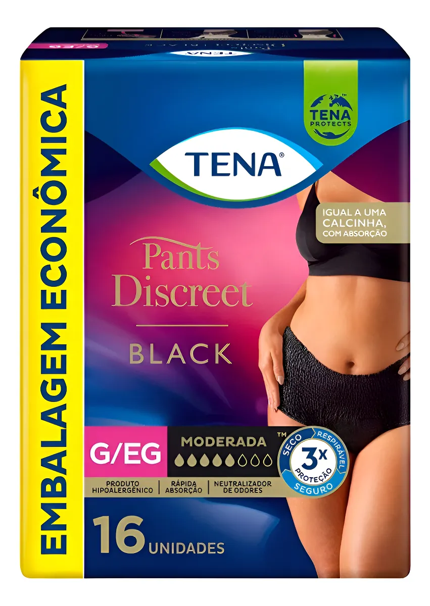 TENA Pants Discreet é uma excelente opção para mulheres ativas com incontinência urinária moderada, mais segura, feminina e discreta. Ela proporciona conforto, facilidade de uso. A calcinha absorvente TENA Pants Discreet é como uma calcinha que a mulher está acostumada a usar e se molda perfeitamente ao corpo. Pants Discreet oferece discrição, conforto e proteção. Também tem rápida absorção, neutralizador de odores, proporcionando maior segurança contra vazamento. A Calcinha Descartável Tena é projetada para ser usada como uma roupa de baixo comum, mas com a funcionalidade de absorção garantindo segurança e confiança. Tena Pants Discreet é especialmente desenvolvida para permitir que as mulheres mantenham suas atividades diárias com confiança, evitando vazamentos e garantindo um nível de conforto. Disponível nas cores nude e preta (exclusividade). A calcinha descartável TENA discreet também pode ser usada como calcinha absorvente pós-parto, já que possui alta absorção, com maior segurança e conforto. Tamanho: P-M (80 -112 cm): Referência: 30-70 kg.