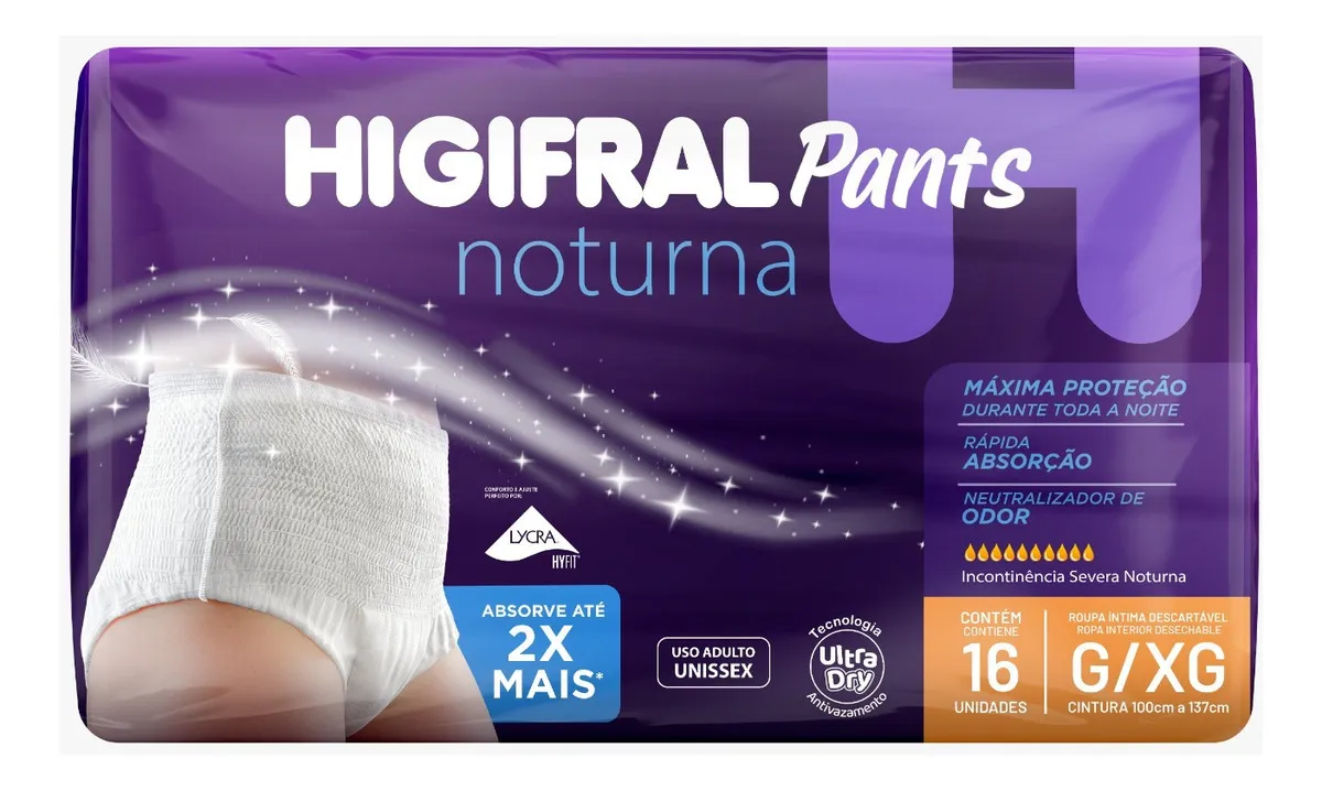 A Fralda Higifral Pants Noturna foi desenvolvida para oferecer proteção extra durante a noite, com conforto e discrição. Seu formato tipo roupa íntima facilita o uso e proporciona mais liberdade de movimentos, enquanto o sistema de absorção avançado garante até 12 horas de segurança contra vazamentos. Indicada para pessoas com incontinência urinária moderada a intensa, a Higifral Pants Noturna possui cintura elástica, toque suave e material respirável que mantém a pele seca e saudável. Ideal para uso noturno, proporciona noites mais tranquilas e seguras.